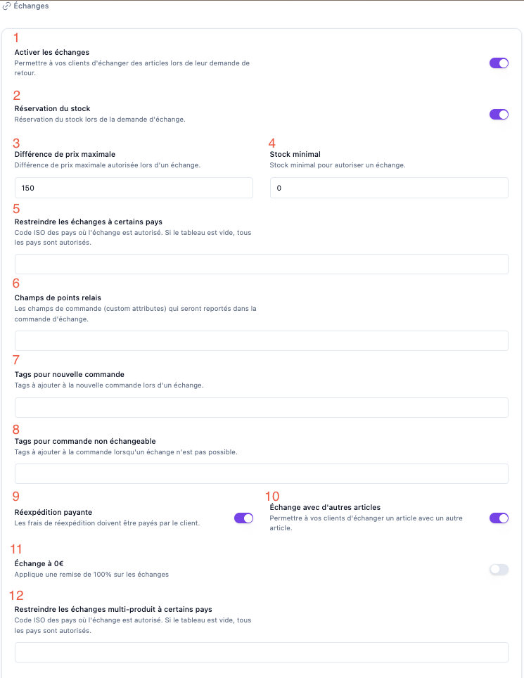 Stock minimal requis dans Shopify : définit le seuil pour qu’une variante soit proposé à l’échange standard.